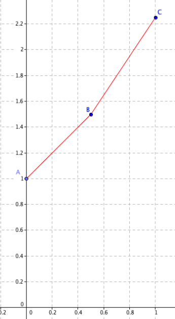 On coupe à présent l'intervalle [0 ;1] en deux parties. En \(x=0,5\), on actualise la pente du segment de droite en fonction de la valeur approximative de \(f\).