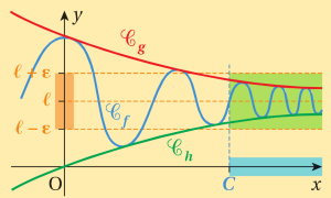 Soit \(f\) , \(g\) et \(h\) trois fonctions définies sur un intervalle \(I\) voisinage de α, α étant un réel, \(+\infty\) ou \(-\infty\)