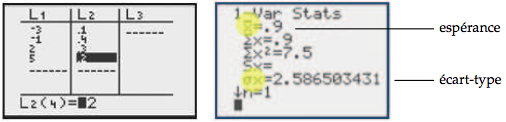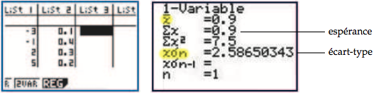 L'espérance et l'écart type d'une variable aléatoire ne sont rien d'autre que la moyenne et l'écart type d'une série statistique. On peut donc utiliser les fonctions statistiques de la calculatrice pour les déterminer.