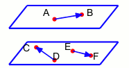 \(\overrightarrow{AB}\), \(\overrightarrow{DC}\) et \(\overrightarrow{EF}\) peuvent être coplanaires sans que les points \(A\), \(B\), \(C\), \(D\), \(E\) et \(F\) soient dans un même plan !