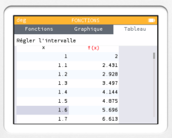 Si on cherche une valeur approchée plus précise de la solution, on utilisera à nouveau la fonction table entre \(1,5\) et \(1,6\) avec un pas de \(0,01\) et ainsi de suite.