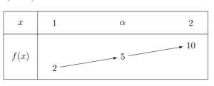 Le théorème des valeurs intermédiaires permet donc d'affirmer qu'il existe une unique solution \(\alpha\in [1 ;2]\) tel que \(f(c)=5\).