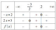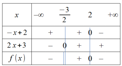 Le second problème qui se pose est au niveau de la racine. L'intérieur de la racine doit être positif ou nul. Nous devons donc déterminer le signe de \(f(x)=\frac{-x+2}{2x+3}\) au moyen par exemple d'un tableau de signes.