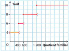 Le graphique ci-contre représente le tarif (en euros) à la journée pratiqué par une commune pour l'accueil des enfants selon le quotient familial (en euros) du foyer.