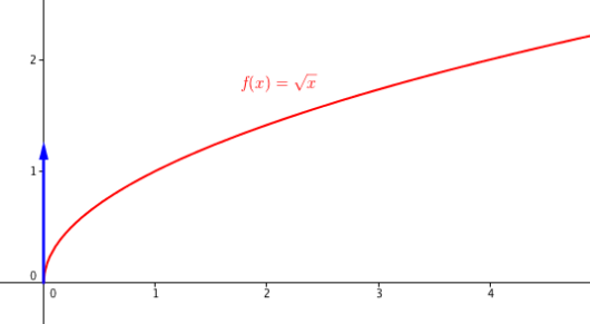 On fera attention au fait que l'intervalle de définition de \(f\) n'est pas le même que celui sur lequel \(f\) est dérivable. En effet, la fonction racine n'est pas dérivable en 0.