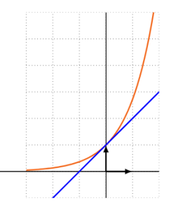 La tangente à la courbe de la fonction exponentielle au point d'abscisse 0 a pour équation \(y=\exp′(0)(x−0)+\exp(0)\), c'est-à-dire \(y=x+1\).