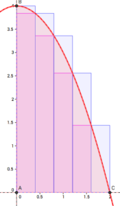 On appelle \(S_2(n)\) la somme des rectangles au dessus de la courbe s'appuyant sur les \(n\) intervalles définis ci-dessus.