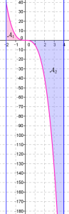 En résumé \(\displaystyle \int_{-2}^4 -5x^3~\mathrm dx=\mathcal A_1 - \mathcal A_2=-300\). L'intégrale négative indique qu'il y a plus de surface de courbe sous l'axe des abscisses (bleu) qu'au dessus (rose).