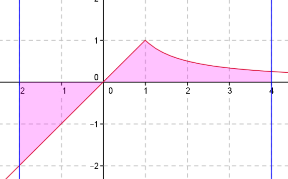 \(\displaystyle \int_{-2}^4 f(x)~\mathrm dx=\int_{-2}^1 f(x)~\mathrm dx+\int_{1}^4 f(x)~\mathrm dx=-1,5+\ln 4\).