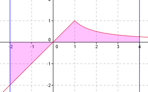 Pour l'aire du domaine, il faut compter \(\displaystyle \int_{-2}^4 f(x)~\mathrm dx=\int_{-2}^0 f(x)~\mathrm dx+\int_{0}^1 f(x)~\mathrm dx+\int_{1}^4 f(x)~\mathrm dx\).